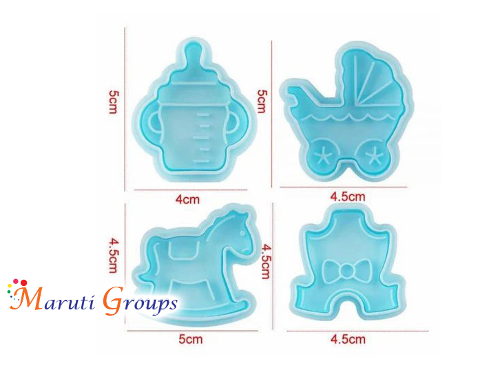 4pc Baby Shower Plunger Cutter / Cookie Cutter - Baby Grower, Bottle, Pram, Rocking Horse