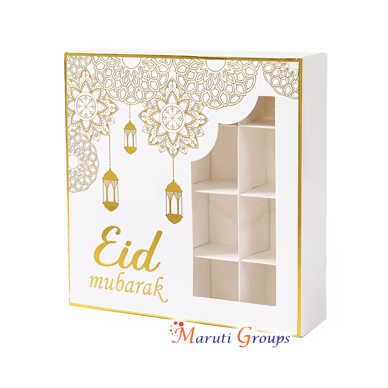 Add a festive and elegant touch to your celebrations with this white and gold Eid Mubarak gift box featuring a beautiful lantern design. Perfect for packaging sweets, chocolates, small treats, jewelry, and party favors, this gift box enhances your Eid gifting presentation.
