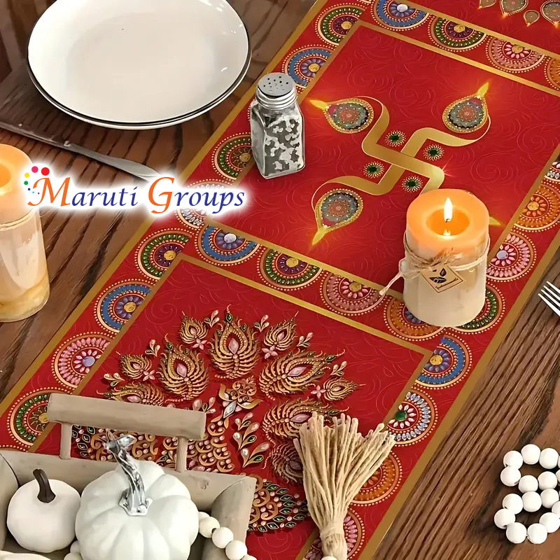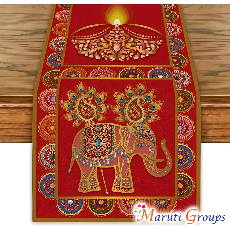 Add a touch of festive charm to your home dΓ©cor with our Happy Diwali Indian Elephant Table Runner. Designed in rich red and golden hues, this elegant piece features traditional peacock and mandala motifs, symbolizing prosperity and celebration. Perfect for Diwali, weddings, festive gatherings, or everyday dΓ©cor, it instantly enhances any dining or coffee table with a warm, cultural aesthetic.