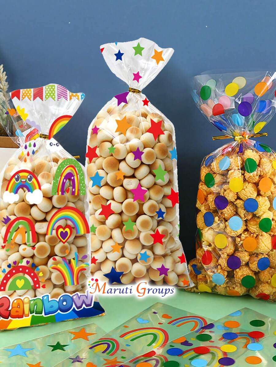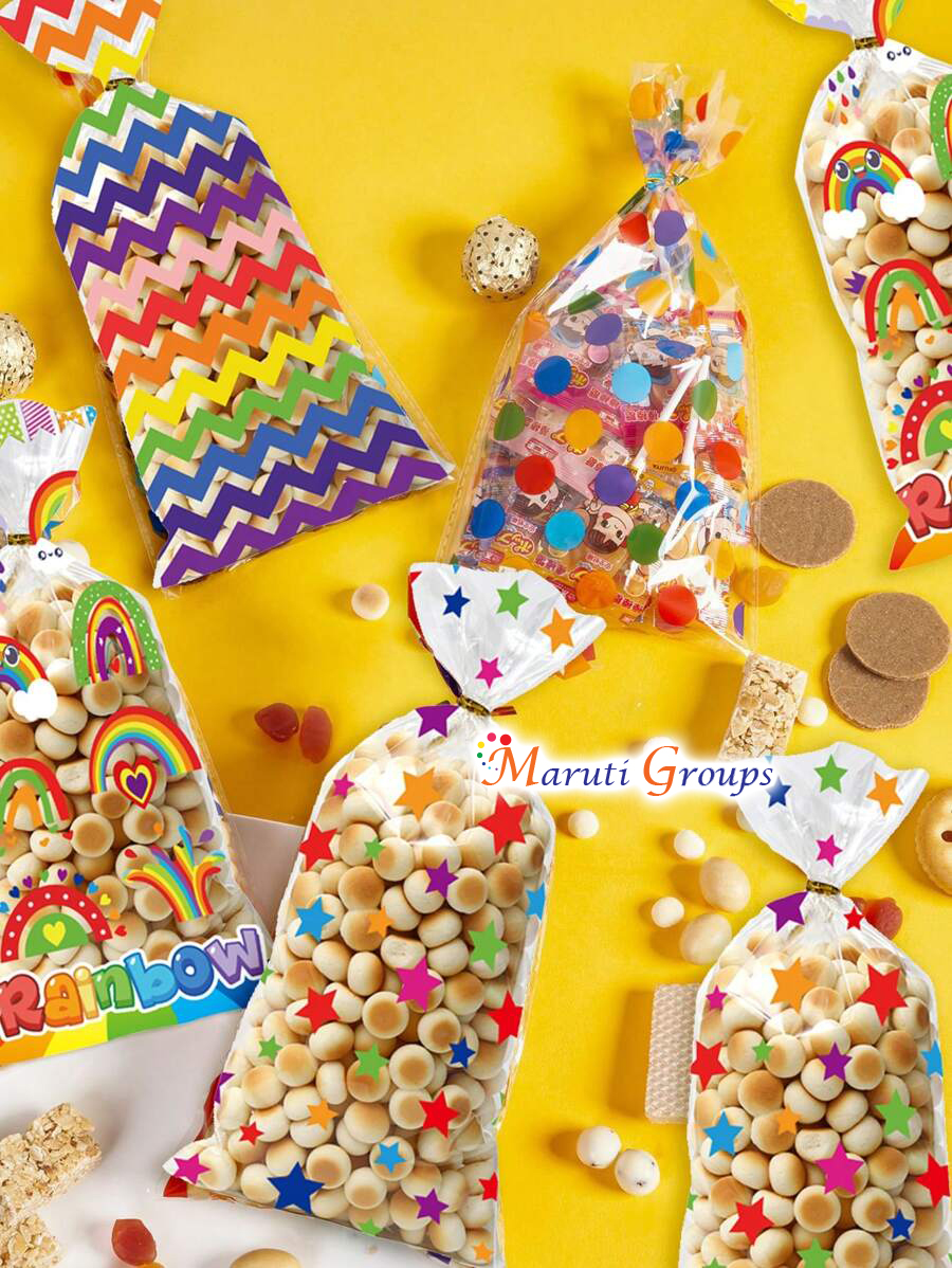 Brighten up your gift packaging with these 25pcs DIY Rainbow Theme Candy Bags! Designed with a colorful rainbow pattern, these cellophane bags are ideal for holding sweets, chocolates, puffed rice, biscuits, or party favors for birthdays, baby showers, or festive events.